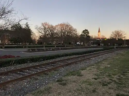 Misenheimer avec bâtiments de l'Université Pfeiffer en arrière-plan, ligne du Norfolk Southern Railroad au premier plan
