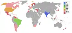 | Disparitions | Australie, Autriche, Bolivie, Colombie, Liberia, Nicaragua, Nigeria, Pérou, Rhodésie, Tunisie, Uruguay | |||||||