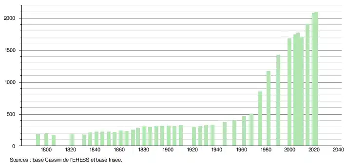 L'évolution du nombre d'habitants est connue à travers les recensements de la population effectués dans la commune depuis 1793. Pour les communes de moins de 10 000 habitants, une enquête de recensement portant sur toute la population est réalisée tous les cinq ans, les populations légales des années intermédiaires étant quant à elles estimées par interpolation ou extrapolation[23]. Pour la commune, le premier recensement exhaustif entrant dans le cadre du nouveau dispositif a été réalisé en 2004[24].