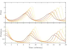 Solutions des équations de Lotka-Volterra obtenues par un algorithme de Runge-Kutta d'ordre 4, pour une valeur de , , et , pour une gamme de conditions initiales (échelle de couleurs, du rouge au jaune clair) de à .