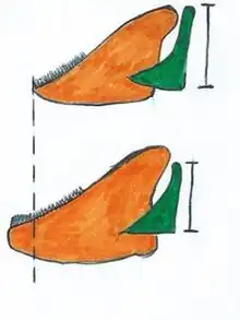 À la suite de cette divergence, le développement de la mâchoire selon le type d’alimentation suit une ligne directrice rapide afin d’atteindre un optimum dans chacun des deux types d’alimentation. Les chercheurs observent que les gènes QTL ont un effet sur la variabilité de la longueur et de la hauteur de la mâchoire inférieure. Ce phénomène démontre une pléiotropie où seulement un gène peut produire plusieurs phénotypes de mâchoires. Il est observé que le ratio entre la hauteur du bras ascendant de l’articulation et la longueur de la mâchoire régulera la vitesse et la force de fermeture de la mâchoire. Ainsi, pour le mode de nutrition par morsure, soit l’espèce Labeotropheus fuelleborni, un long processus articulaire et une courte mâchoire inférieure seront favorisés, permettant ainsi une forte fermeture. Tandis que pour l’espèce Metriaclima zebra, un court processus et une longue mâchoire inférieure affecteront la vitesse de rotation de la mâchoire et sera plus typique pour une alimentation par succion (Figure 4, où la mâchoire est orange et le processus articulaire vert).