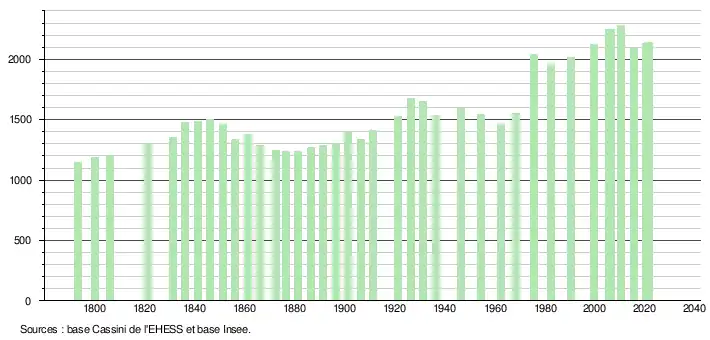 L'évolution du nombre d'habitants est connue à travers les recensements de la population effectués dans la commune depuis 1793. Pour les communes de moins de 10 000 habitants, une enquête de recensement portant sur toute la population est réalisée tous les cinq ans, les populations légales des années intermédiaires étant quant à elles estimées par interpolation ou extrapolation[30]. Pour la commune, le premier recensement exhaustif entrant dans le cadre du nouveau dispositif a été réalisé en 2005[31].