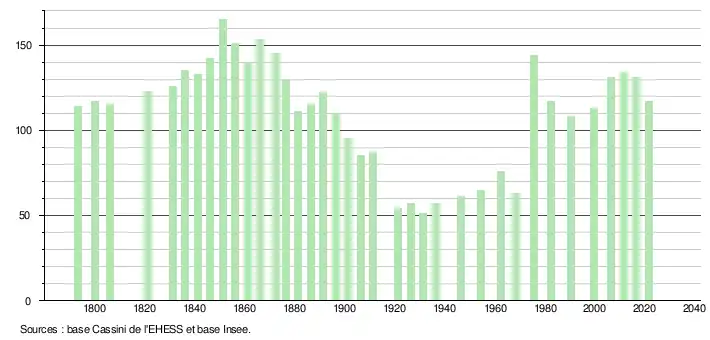 L'évolution du nombre d'habitants est connue à travers les recensements de la population effectués dans la commune depuis 1793. Pour les communes de moins de 10 000 habitants, une enquête de recensement portant sur toute la population est réalisée tous les cinq ans, les populations légales des années intermédiaires étant quant à elles estimées par interpolation ou extrapolation[16]. Pour la commune, le premier recensement exhaustif entrant dans le cadre du nouveau dispositif a été réalisé en 2006[17].