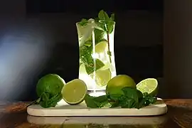 - Une dizaine de feuilles de menthe indienne (appelée hierba buena, yerba buena ou hierbabuena en Amérique latine)[6], sinon de menthe poivrée[7], au goût assez proche, pressées plutôt que pilées (ce qui augmente l'amertume). les Cubains utilisent de préférence les tiges de menthe[8].