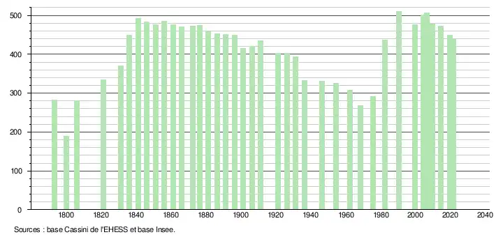 L'évolution du nombre d'habitants est connue à travers les recensements de la population effectués dans la commune depuis 1793. Pour les communes de moins de 10 000 habitants, une enquête de recensement portant sur toute la population est réalisée tous les cinq ans, les populations légales des années intermédiaires étant quant à elles estimées par interpolation ou extrapolation[33]. Pour la commune, le premier recensement exhaustif entrant dans le cadre du nouveau dispositif a été réalisé en 2004[34].
