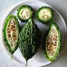 Momordica charantia var minima à fruits verts de diamètre inférieur à 5 cm Leurs longueurs sont variables: courts 6-7 cm de long, moyens 8-12 cm et longs 12-22 cm. Certains sont pourvus de protubérances arrondies et d'ailes épaisses de 1-2 cm de long.