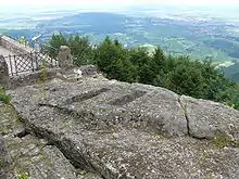Vue sur la plaine depuis le mont Sainte-Odile. En bas au milieu des sapins l'hôtel Saint-Jacques et à droite l'abbaye en ruines de Niedermunster cachée par les arbres. Vue sur la plaine depuis le mont Sainte-Odile. En bas au milieu des sapins l'hôtel Saint-Jacques et à droite l'abbaye en ruines de Niedermunster cachée par les arbres.