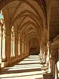 Le monastère possède depuis l'origine un simple cloître roman construit entre la fin du XIIe et le début du XIIIe siècle. À la demande du roi Jacques II d'Aragon et avec son appui, l'abbé Pere Alegre commença en 1313 la démolition de l'ancien cloître et la construction du nouveau sans modifier les autres bâtiments existants autour (l'église, la salle capitulaire, les fermes). La seule chose qu'il reste du cloître primitif est le kiosque qui abrite la pile-lavoir par laquelle les moines se lavaient les mains après les travaux agricoles, avant de passer au réfectoire ou d'aller prier.