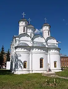 La cathédrale de la Déposition-de-la-Robe (1520-1560) est un exemple d'édifice sans piliers avec, du côté de l'autel, trois absides accolées. La construction est en carré, à quatre façades et l'ensemble est recouvert de trois coupoles. L'intérieur est dépourvu de structures porteuses apparentes, sinon les murs latéraux. L'édifice est couronné de trois hautes et légères coupoles, ce qui est inhabituel à cette époque, dans ce type de bâtiment. Les murs lisses sont découpés d'embrasures de fenêtres de style simple ; quant aux façades de côté elles sont surmontées de zakomars. Ils sont quatre, mais séparés sur la façade par trois pilastres. Ils surmontent un portail au centre de la façade. Le parvis, construit en 1688 à l'ouest de l'église, se distingue par une décoration très riche comprenant un portail sculpté, avec des colonnes garnies de tresses et de faïences, entouré de chambranles décorés. Les coupoles de la cathédrale ont connu quelques transformations au cours des siècles. Leur forme initiale de casque a été modifiée en forme de bulbes au cours du XIXe siècle. En 1929, la cathédrale fut transformée en centrale électrique et ce n'est qu'en 1960 que lors de la restauration qui a lieu à cette époque, que ces coupoles retrouvent leur forme originelle[6]