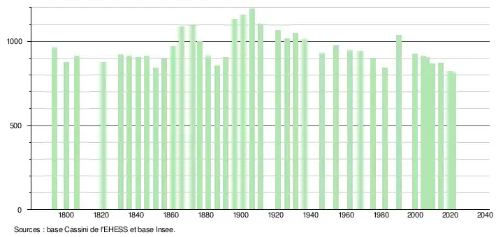 L'évolution du nombre d'habitants est connue à travers les recensements de la population effectués dans la commune depuis 1793. Pour les communes de moins de 10 000 habitants, une enquête de recensement portant sur toute la population est réalisée tous les cinq ans, les populations légales des années intermédiaires étant quant à elles estimées par interpolation ou extrapolation[26]. Pour la commune, le premier recensement exhaustif entrant dans le cadre du nouveau dispositif a été réalisé en 2004[27]. En 2021, la commune comptait 815 habitants[Note 2], en diminution de 6,21 % par rapport à 2015 (Gironde : +6,88 %, France hors Mayotte : +1,84 %).