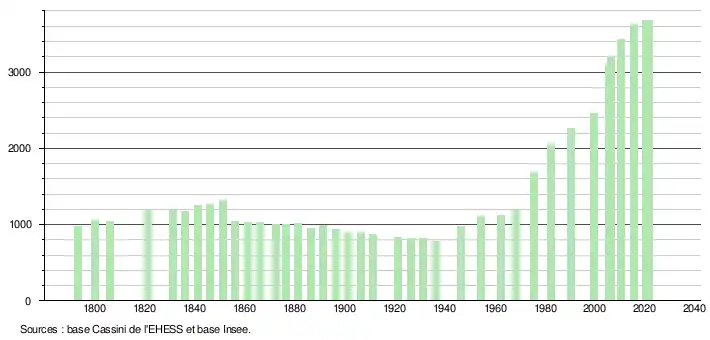 L'évolution du nombre d'habitants est connue à travers les recensements de la population effectués dans la commune depuis 1793. Pour les communes de moins de 10 000 habitants, une enquête de recensement portant sur toute la population est réalisée tous les cinq ans, les populations légales des années intermédiaires étant quant à elles estimées par interpolation ou extrapolation[25]. Pour la commune, le premier recensement exhaustif entrant dans le cadre du nouveau dispositif a été réalisé en 2005[26].