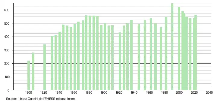 L'évolution du nombre d'habitants est connue à travers les recensements de la population effectués dans la commune depuis 1800. Pour les communes de moins de 10 000 habitants, une enquête de recensement portant sur toute la population est réalisée tous les cinq ans, les populations légales des années intermédiaires étant quant à elles estimées par interpolation ou extrapolation[18]. Pour la commune, le premier recensement exhaustif entrant dans le cadre du nouveau dispositif a été réalisé en 2004[19].