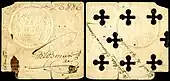 « On prétend parfois que la monnaie de papier émise en 1690 par la colonie de Massachusetts Bay afin de payer les soldats revenant d'une expédition au Canada après la Première Guerre intercoloniale, fut le premier papier-monnaie émis en Amérique, mais la monnaie de carte à jouer canadienne avait fait son apparition cinq ans plus tôt. Un économiste[26] observa que les colons du Massachusetts, face au succès remporté par la monnaie de carte canadienne, s'y sont familiarisés et il suggère que c'est peut-être ce qui a donné par la suite à cette colonie l'idée d'émettre de la monnaie de papier. »