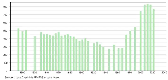 L'évolution du nombre d'habitants est connue à travers les recensements de la population effectués dans la commune depuis 1793. Pour les communes de moins de 10 000 habitants, une enquête de recensement portant sur toute la population est réalisée tous les cinq ans, les populations légales des années intermédiaires étant quant à elles estimées par interpolation ou extrapolation[20]. Pour la commune, le premier recensement exhaustif entrant dans le cadre du nouveau dispositif a été réalisé en 2006[21].