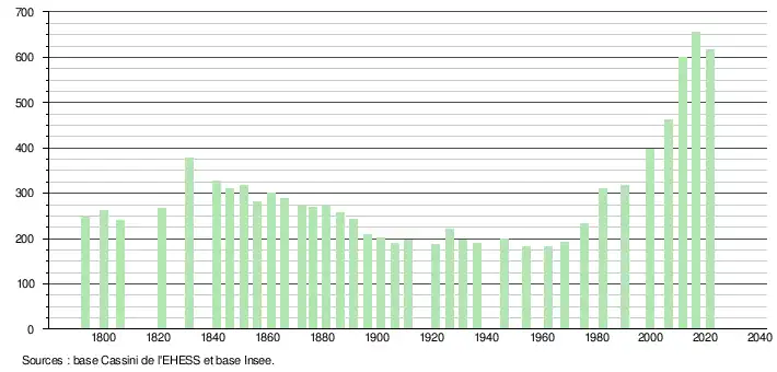 - Population municipale légale en vigueur au 1er janvier 2024, millésimée 2021, définie dans les limites territoriales en vigueur au 1er janvier 2023, date de référence statistique : 1er janvier 2021.