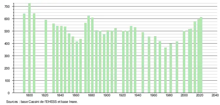 L'évolution du nombre d'habitants est connue à travers les recensements de la population effectués dans la commune depuis 1793. Pour les communes de moins de 10 000 habitants, une enquête de recensement portant sur toute la population est réalisée tous les cinq ans, les populations légales des années intermédiaires étant quant à elles estimées par interpolation ou extrapolation[21]. Pour la commune, le premier recensement exhaustif entrant dans le cadre du nouveau dispositif a été réalisé en 2008[22].