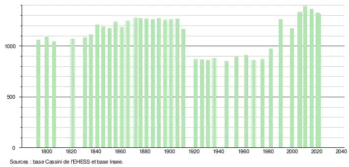 L'évolution du nombre d'habitants est connue à travers les recensements de la population effectués dans la commune depuis 1793. Pour les communes de moins de 10 000 habitants, une enquête de recensement portant sur toute la population est réalisée tous les cinq ans, les populations légales des années intermédiaires étant quant à elles estimées par interpolation ou extrapolation[30]. Pour la commune, le premier recensement exhaustif entrant dans le cadre du nouveau dispositif a été réalisé en 2005[31].