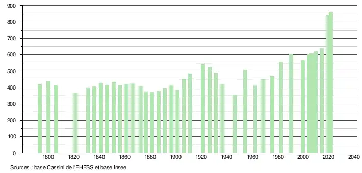 L'évolution du nombre d'habitants est connue à travers les recensements de la population effectués dans la commune depuis 1793. Pour les communes de moins de 10 000 habitants, une enquête de recensement portant sur toute la population est réalisée tous les cinq ans, les populations légales des années intermédiaires étant quant à elles estimées par interpolation ou extrapolation[18]. Pour la commune, le premier recensement exhaustif entrant dans le cadre du nouveau dispositif a été réalisé en 2004[19].