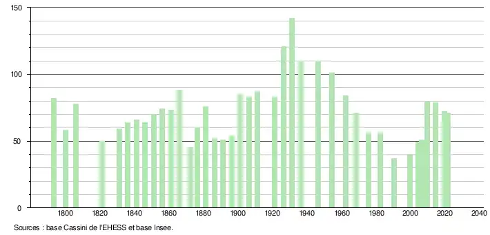 L'évolution du nombre d'habitants est connue à travers les recensements de la population effectués dans la commune depuis 1793. Pour les communes de moins de 10 000 habitants, une enquête de recensement portant sur toute la population est réalisée tous les cinq ans, les populations légales des années intermédiaires étant quant à elles estimées par interpolation ou extrapolation[24]. Pour la commune, le premier recensement exhaustif entrant dans le cadre du nouveau dispositif a été réalisé en 2004[25].