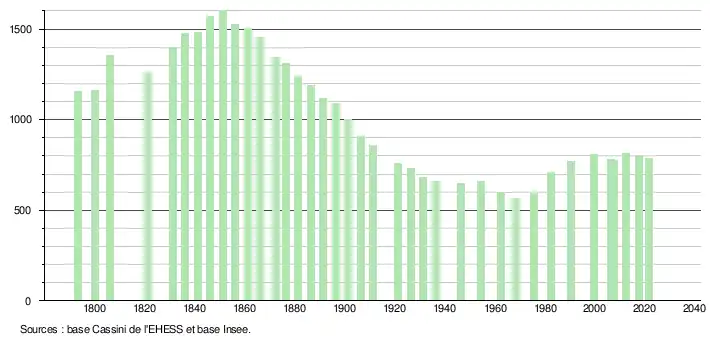 L'évolution du nombre d'habitants est connue à travers les recensements de la population effectués dans la commune depuis 1793. Pour les communes de moins de 10 000 habitants, une enquête de recensement portant sur toute la population est réalisée tous les cinq ans, les populations légales des années intermédiaires étant quant à elles estimées par interpolation ou extrapolation[15]. Pour la commune, le premier recensement exhaustif entrant dans le cadre du nouveau dispositif a été réalisé en 2007[16].