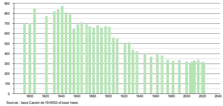 L'évolution du nombre d'habitants est connue à travers les recensements de la population effectués dans la commune depuis 1793. Pour les communes de moins de 10 000 habitants, une enquête de recensement portant sur toute la population est réalisée tous les cinq ans, les populations légales des années intermédiaires étant quant à elles estimées par interpolation ou extrapolation[17]. Pour la commune, le premier recensement exhaustif entrant dans le cadre du nouveau dispositif a été réalisé en 2004[18].