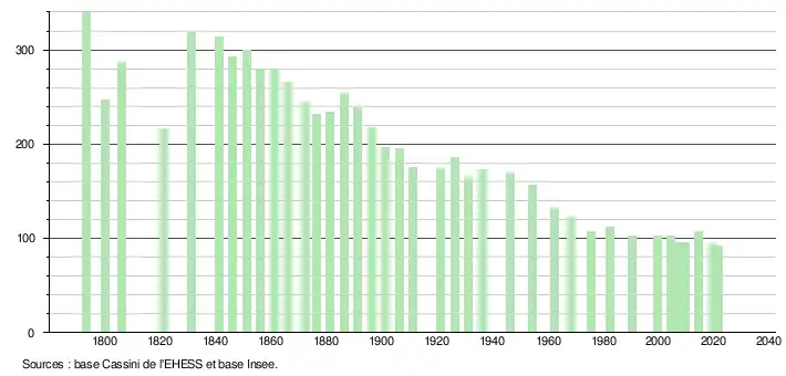 | L'évolution du nombre d'habitants est connue à travers les recensements de la population effectués dans la commune depuis 1793. Pour les communes de moins de 10 000 habitants, une enquête de recensement portant sur toute la population est réalisée tous les cinq ans, les populations légales des années intermédiaires étant quant à elles estimées par interpolation ou extrapolation[24]. Pour la commune, le premier recensement exhaustif entrant dans le cadre du nouveau dispositif a été réalisé en 2004[25]. En 2021, la commune comptait 92 habitants[Note 3], en diminution de 15,6 % par rapport à 2015 (Gers : +0,79 %, France hors Mayotte : +1,84 %). |