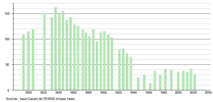 | L'évolution du nombre d'habitants est connue à travers les recensements de la population effectués dans la commune depuis 1793. Pour les communes de moins de 10 000 habitants, une enquête de recensement portant sur toute la population est réalisée tous les cinq ans, les populations légales des années intermédiaires étant quant à elles estimées par interpolation ou extrapolation[30]. Pour la commune, le premier recensement exhaustif entrant dans le cadre du nouveau dispositif a été réalisé en 2006[31]. En 2021, la commune comptait 31 habitants[Note 6], en diminution de 22,5 % par rapport à 2015 (Haute-Garonne : +7,43 %, France hors Mayotte : +1,84 %). |