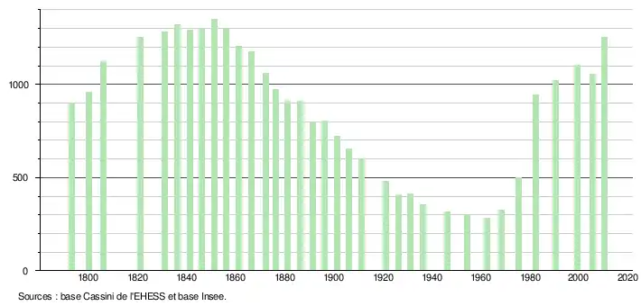L'évolution du nombre d'habitants est connue à travers les recensements de la population effectués dans la commune depuis 1793. À partir du , les populations légales des communes sont publiées annuellement dans le cadre d'un recensement qui repose désormais sur une collecte d'information annuelle, concernant successivement tous les territoires communaux au cours d'une période de cinq ans. Pour les communes de moins de 10 000 habitants, une enquête de recensement portant sur toute la population est réalisée tous les cinq ans, les populations légales des années intermédiaires étant quant à elles estimées par interpolation ou extrapolation[2]. Pour la commune, le premier recensement exhaustif entrant dans le cadre du nouveau dispositif a été réalisé en 2005[3],[Note 1].
