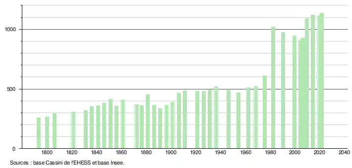 L'évolution du nombre d'habitants est connue à travers les recensements de la population effectués dans la commune depuis 1793. Pour les communes de moins de 10 000 habitants, une enquête de recensement portant sur toute la population est réalisée tous les cinq ans, les populations légales des années intermédiaires étant quant à elles estimées par interpolation ou extrapolation[19]. Pour la commune, le premier recensement exhaustif entrant dans le cadre du nouveau dispositif a été réalisé en 2004[20].