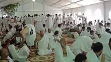 Aujourd'hui, c'est au mont Arafat qu'est délivré un khutba (sermon) de grande importance, destiné à l'ensemble de la communauté musulmane (la Oumma), car à leur retour, ce message est répercuté par les pèlerins dans leurs patries respectives. Ce prêche fait écho au célèbre sermon dit de « l'Adieu » que le Prophète prononça à midi, et qui commençait ainsi : « Ô gens, écoutez-moi, car je ne sais si je serai présent parmi vous en ce lieu, une fois passée cette année... »[4]. C'est également à Arafat que sera révélé à Mahomet un verset essentiel aux yeux des musulmans : « Aujourd'hui, j'ai rendu parfaite votre religion ; J'ai parachevé Ma grâce sur vous ; J'ai agréé l'islam comme étant votre religion » (Coran, 5,3)[4]. Une fois ce sermon terminé, le Prophète accomplit la prière de midi qu'il enchaîna directement avec celle de l'après-midi, à la suite de quoi il resta debout en prière jusqu'au coucher du soleil. C'est le wuqûf (la « station », l'« arrêt »), qui est aujourd'hui un élément obligatoire du hajj. Cela explique que manquer cette étape dans la plaine d'Arafat au moment prescrit frappe le pèlerinage de nullité. Et que l'on puisse même résumer le pèlerinage à cette station à Arafat au jour prévu, ainsi que l'affirme un hadith du Prophète rapportant cette parole qu'il aurait eue à cette occasion : « le hajj, c'est Arafat »[4],[5].