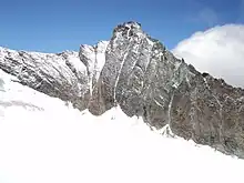 Vue de la face nord de la Grivola avec, à gauche (nord-est), le glacier du Nomenon et, à droite (nord-ouest), le petit glacier de Belleface. | |||