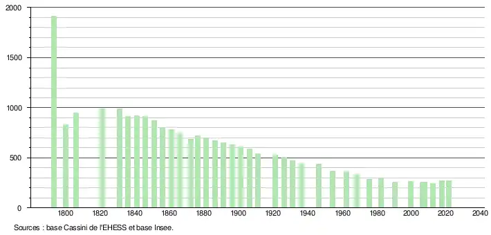 | L'évolution du nombre d'habitants est connue à travers les recensements de la population effectués dans la commune depuis 1793. Pour les communes de moins de 10 000 habitants, une enquête de recensement portant sur toute la population est réalisée tous les cinq ans, les populations légales des années intermédiaires étant quant à elles estimées par interpolation ou extrapolation[27]. Pour la commune, le premier recensement exhaustif entrant dans le cadre du nouveau dispositif a été réalisé en 2007[28]. En 2021, la commune comptait 271 habitants[Note 4], en augmentation de 5,04 % par rapport à 2015 (Lot-et-Garonne : −0,66 %, France hors Mayotte : +1,84 %). |