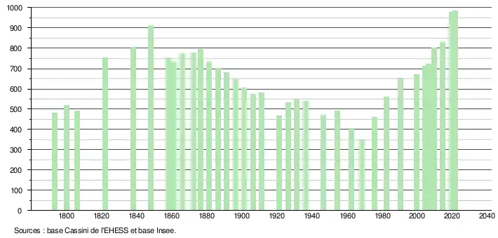 L'évolution du nombre d'habitants est connue à travers les recensements de la population effectués dans la commune depuis 1793. Pour les communes de moins de 10 000 habitants, une enquête de recensement portant sur toute la population est réalisée tous les cinq ans, les populations légales des années intermédiaires étant quant à elles estimées par interpolation ou extrapolation[38]. Pour la commune, le premier recensement exhaustif entrant dans le cadre du nouveau dispositif a été réalisé en 2004[39].