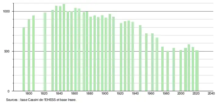 L'évolution du nombre d'habitants est connue à travers les recensements de la population effectués dans la commune depuis 1793. Pour les communes de moins de 10 000 habitants, une enquête de recensement portant sur toute la population est réalisée tous les cinq ans, les populations légales des années intermédiaires étant quant à elles estimées par interpolation ou extrapolation[19]. Pour la commune, le premier recensement exhaustif entrant dans le cadre du nouveau dispositif a été réalisé en 2005[20].