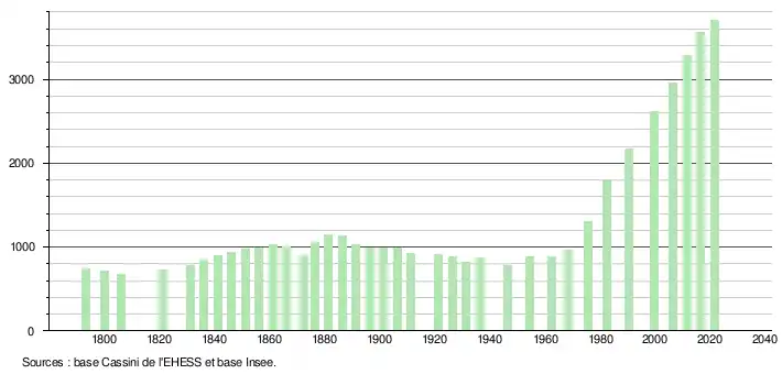 L'évolution du nombre d'habitants est connue à travers les recensements de la population effectués dans la commune depuis 1793. Pour les communes de moins de 10 000 habitants, une enquête de recensement portant sur toute la population est réalisée tous les cinq ans, les populations légales des années intermédiaires étant quant à elles estimées par interpolation ou extrapolation[39]. Pour la commune, le premier recensement exhaustif entrant dans le cadre du nouveau dispositif a été réalisé en 2006[40].