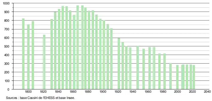L'évolution du nombre d'habitants est connue à travers les recensements de la population effectués dans la commune depuis 1793. Pour les communes de moins de 10 000 habitants, une enquête de recensement portant sur toute la population est réalisée tous les cinq ans, les populations légales des années intermédiaires étant quant à elles estimées par interpolation ou extrapolation[14]. Pour la commune, le premier recensement exhaustif entrant dans le cadre du nouveau dispositif a été réalisé en 2007[15].