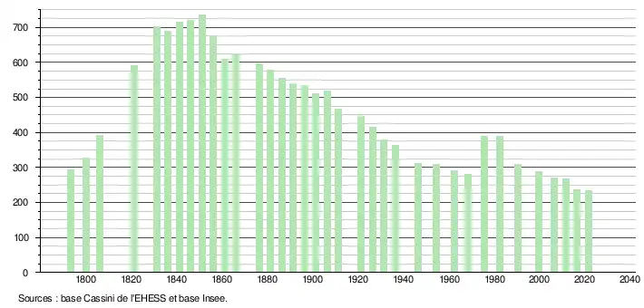 - Population municipale légale en vigueur au 1er janvier 2024, millésimée 2021, définie dans les limites territoriales en vigueur au 1er janvier 2023, date de référence statistique : 1er janvier 2021.