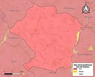 Le retrait-gonflement des sols argileux est susceptible d'engendrer des dommages importants aux bâtiments en cas d’alternance de périodes de sécheresse et de pluie[20]. La totalité de la commune est en aléa moyen ou fort (91,8 % au niveau départemental et 48,5 % au niveau national)[Carte 2]. Depuis le , en application de la loi ELAN, différentes contraintes s'imposent aux vendeurs, maîtres d'ouvrages ou constructeurs de biens situés dans une zone classée en aléa moyen ou fort[Note 2],[21].
