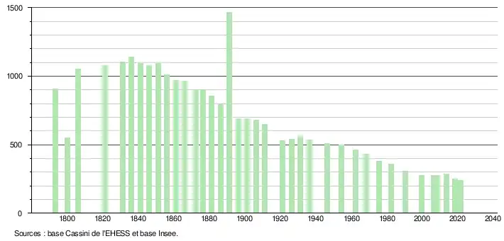 L'évolution du nombre d'habitants est connue à travers les recensements de la population effectués dans la commune depuis 1793. Pour les communes de moins de 10 000 habitants, une enquête de recensement portant sur toute la population est réalisée tous les cinq ans, les populations légales des années intermédiaires étant quant à elles estimées par interpolation ou extrapolation[22]. Pour la commune, le premier recensement exhaustif entrant dans le cadre du nouveau dispositif a été réalisé en 2008[23].
