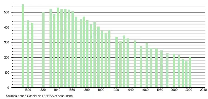 L'évolution du nombre d'habitants est connue à travers les recensements de la population effectués dans la commune depuis 1793. Pour les communes de moins de 10 000 habitants, une enquête de recensement portant sur toute la population est réalisée tous les cinq ans, les populations légales des années intermédiaires étant quant à elles estimées par interpolation ou extrapolation[22]. Pour la commune, le premier recensement exhaustif entrant dans le cadre du nouveau dispositif a été réalisé en 2006[23].