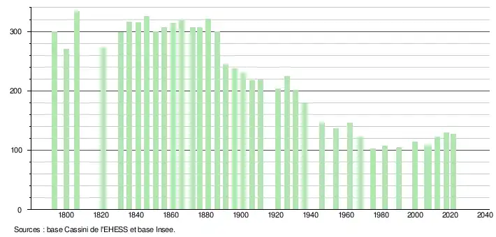 L'évolution du nombre d'habitants est connue à travers les recensements de la population effectués dans la commune depuis 1793. Pour les communes de moins de 10 000 habitants, une enquête de recensement portant sur toute la population est réalisée tous les cinq ans, les populations légales des années intermédiaires étant quant à elles estimées par interpolation ou extrapolation[50]. Pour la commune, le premier recensement exhaustif entrant dans le cadre du nouveau dispositif a été réalisé en 2007[51].