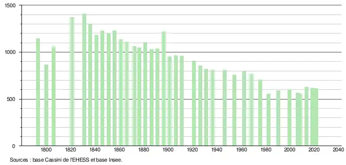 | L'évolution du nombre d'habitants est connue à travers les recensements de la population effectués dans la commune depuis 1793. Pour les communes de moins de 10 000 habitants, une enquête de recensement portant sur toute la population est réalisée tous les cinq ans, les populations légales des années intermédiaires étant quant à elles estimées par interpolation ou extrapolation[54]. Pour la commune, le premier recensement exhaustif entrant dans le cadre du nouveau dispositif a été réalisé en 2008[55]. En 2021, la commune comptait 613 habitants[Note 5], en diminution de 4,81 % par rapport à 2015 (Landes : +4,9 %, France hors Mayotte : +1,84 %). |