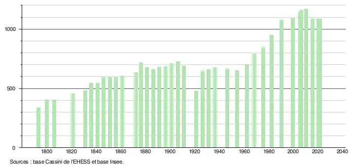 L'évolution du nombre d'habitants est connue à travers les recensements de la population effectués dans la commune depuis 1793. Pour les communes de moins de 10 000 habitants, une enquête de recensement portant sur toute la population est réalisée tous les cinq ans, les populations légales des années intermédiaires étant quant à elles estimées par interpolation ou extrapolation[20]. Pour la commune, le premier recensement exhaustif entrant dans le cadre du nouveau dispositif a été réalisé en 2005[21].