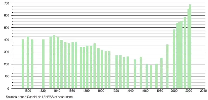 | L'évolution du nombre d'habitants est connue à travers les recensements de la population effectués dans la commune depuis 1793. Pour les communes de moins de 10 000 habitants, une enquête de recensement portant sur toute la population est réalisée tous les cinq ans, les populations légales des années intermédiaires étant quant à elles estimées par interpolation ou extrapolation[31]. Pour la commune, le premier recensement exhaustif entrant dans le cadre du nouveau dispositif a été réalisé en 2004[32]. En 2021, la commune comptait 689 habitants[Note 4], en augmentation de 18,18 % par rapport à 2015 (Haute-Garonne : +7,43 %, France hors Mayotte : +1,84 %). |