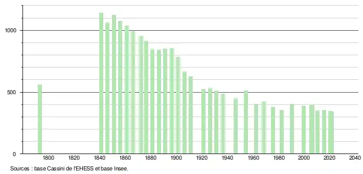 L'évolution du nombre d'habitants est connue à travers les recensements de la population effectués dans la commune depuis 1793. Pour les communes de moins de 10 000 habitants, une enquête de recensement portant sur toute la population est réalisée tous les cinq ans, les populations légales des années intermédiaires étant quant à elles estimées par interpolation ou extrapolation[29]. Pour la commune, le premier recensement exhaustif entrant dans le cadre du nouveau dispositif a été réalisé en 2005[30].