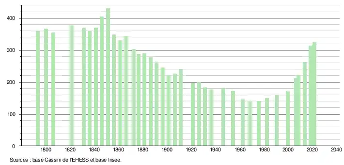 | L'évolution du nombre d'habitants est connue à travers les recensements de la population effectués dans la commune depuis 1793. Pour les communes de moins de 10 000 habitants, une enquête de recensement portant sur toute la population est réalisée tous les cinq ans, les populations légales des années intermédiaires étant quant à elles estimées par interpolation ou extrapolation[30]. Pour la commune, le premier recensement exhaustif entrant dans le cadre du nouveau dispositif a été réalisé en 2008[31]. En 2021, la commune comptait 326 habitants[Note 6], en augmentation de 15,19 % par rapport à 2015 (Tarn : +1,82 %, France hors Mayotte : +1,84 %). |