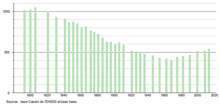 L'évolution du nombre d'habitants est connue à travers les recensements de la population effectués dans la commune depuis 1793. À partir du , les populations légales des communes sont publiées annuellement dans le cadre d'un recensement qui repose désormais sur une collecte d'information annuelle, concernant successivement tous les territoires communaux au cours d'une période de cinq ans. Pour les communes de moins de 10 000 habitants, une enquête de recensement portant sur toute la population est réalisée tous les cinq ans, les populations légales des années intermédiaires étant quant à elles estimées par interpolation ou extrapolation[13]. Pour la commune, le premier recensement exhaustif entrant dans le cadre du nouveau dispositif a été réalisé en 2008[14],[Note 1].
