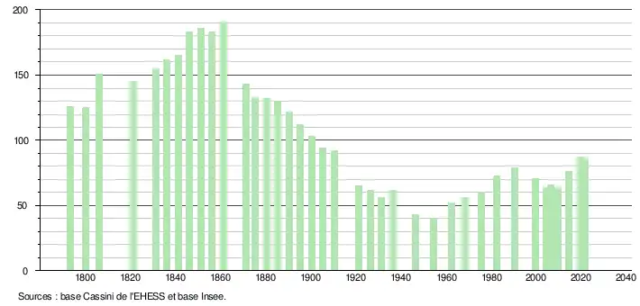 L'évolution du nombre d'habitants est connue à travers les recensements de la population effectués dans la commune depuis 1793. Pour les communes de moins de 10 000 habitants, une enquête de recensement portant sur toute la population est réalisée tous les cinq ans, les populations légales des années intermédiaires étant quant à elles estimées par interpolation ou extrapolation[17]. Pour la commune, le premier recensement exhaustif entrant dans le cadre du nouveau dispositif a été réalisé en 2004[18].