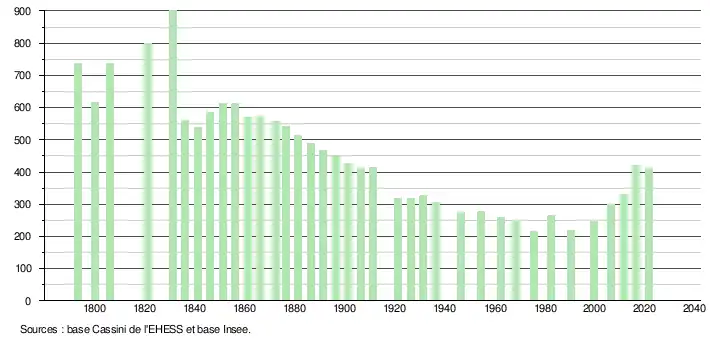 | L'évolution du nombre d'habitants est connue à travers les recensements de la population effectués dans la commune depuis 1793. Pour les communes de moins de 10 000 habitants, une enquête de recensement portant sur toute la population est réalisée tous les cinq ans, les populations légales des années intermédiaires étant quant à elles estimées par interpolation ou extrapolation[31]. Pour la commune, le premier recensement exhaustif entrant dans le cadre du nouveau dispositif a été réalisé en 2006[32]. En 2021, la commune comptait 410 habitants[Note 4], en augmentation de 2,76 % par rapport à 2015 (Tarn : +1,82 %, France hors Mayotte : +1,84 %). |