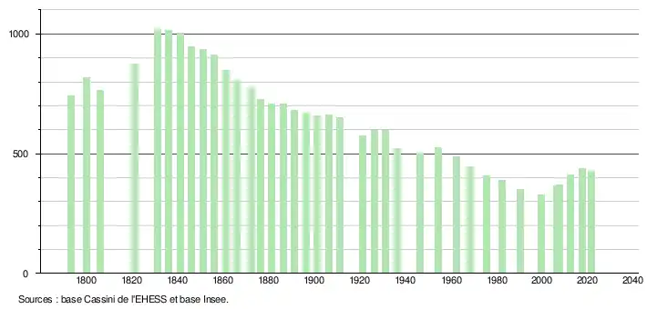 L'évolution du nombre d'habitants est connue à travers les recensements de la population effectués dans la commune depuis 1793. Pour les communes de moins de 10 000 habitants, une enquête de recensement portant sur toute la population est réalisée tous les cinq ans, les populations légales des années intermédiaires étant quant à elles estimées par interpolation ou extrapolation[23]. Pour la commune, le premier recensement exhaustif entrant dans le cadre du nouveau dispositif a été réalisé en 2007[24].